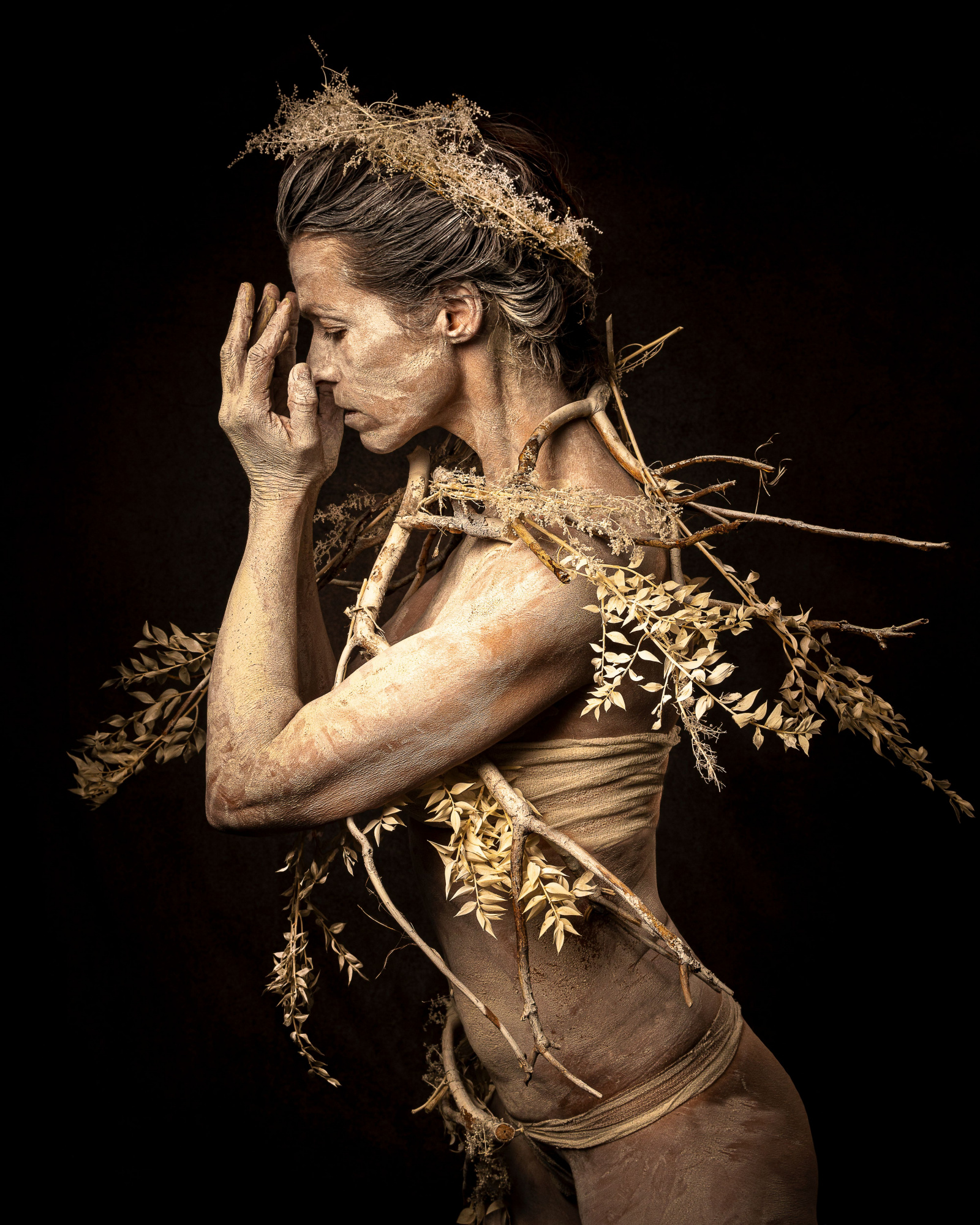 I am responsible for everything that happens in front of the camera. From the image idea to the complete implementation to the poses, I do everything on my own. In addition to the classic bodypainting I like to use materials from nature such as earth, mud, leaves, twigs, etc. and integrate them into my work. I use my body as my canvas and sculpture to turn my ideas into reality. And that is exactly the moment when my husband and photography come into play. But now it’s not just about simply capturing my form of art; the special challenge for him is to portrait my ideas in “the right light”. In the joint post-production we give our images the finishing touches.