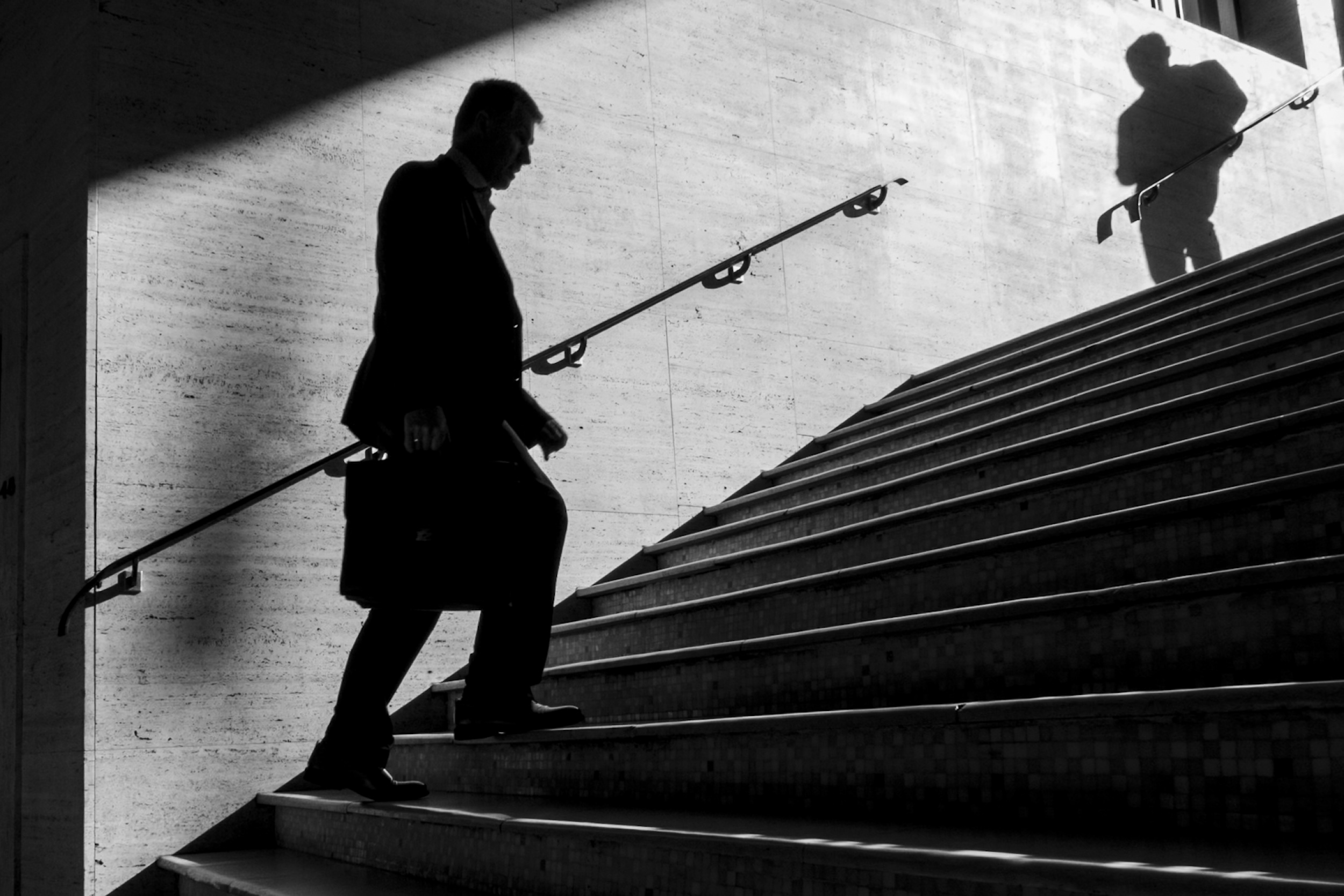 You can also pump up the level of abstraction as I did in the photograph below. The glass and metal structure of the stairways connecting the museum levels was the perfect background for an entangled man.